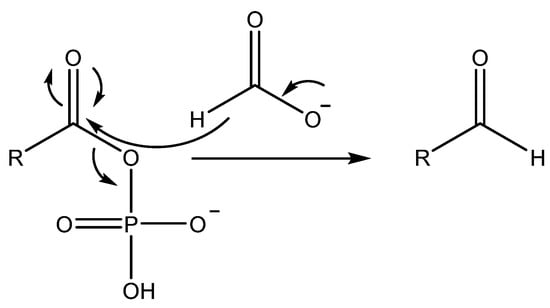 Next, we moved on to the cases for CC/AC and CG/AG. For these cases, there was a further step whose nature needed to be defined prior to carrying out the computations. A key step in the proposed mechanisms was the reduction of a mixed C,P anhydride to yield an aldehyde. The authors of the original paper did not suggest any specific mechanism for this step, while they did note that NADH (nicotinamide adenine dinucleotide), or a prebiotic version of NADH, would be able to carry out the reduction. Since their (and thus our) fundamental assumption about mechanisms was based on the idea that dinucleotides were present, it is not a priori unreasonable to assume that NADH could be present. On the other hand, from a prebiotic perspective, it seemed more logical to us to suggest a simpler reducing agent, and we accordingly proposed again that formate would act as the reductant. Although formate fit into the conditions and scope of our study, it is definitely worth mentioning that other simple inorganic species, such as some minerals, were also used in origins of life studies as reducing agents [60]. As shown in Figure 3, the anhydride reacted with formate, where the hydride from formate was transferred to the carbonyl carbon while the PO4H− group left. We were indeed able to locate transition states for this type of step.
