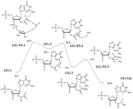 Free energy profile for the GG case. R represents the remainder of the dinucleotide. Relative free energies are in kilocalories per mole.