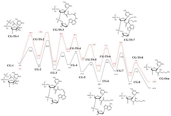 Combined free energy profiles for the CG and AG cases. Black lines correspond to CG and red lines correspond to AG. The geometries are for CG; for AG, the only change in the geometries would be that the first base would be adenine and the keto acid chain has one fewer sp3 carbon.