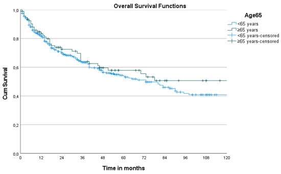 Kaplan–Meier curves of overall survival according to age (p = 0.336).