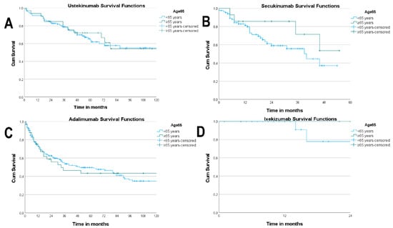 We aimed to determine and quantify any differences in the pattern of use of four biological drugs—adalimumab, ustekinumab, secukinumab, and ixekizumab—establish whether the survival of the drugs is different in older patients and to study the factors that predict drug discontinuation in older (65+ years) and younger (under 65 years) patients.
