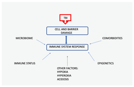 Selected factors that influence the immune response in TBI. The activity of the immune system depends on the homeostasis of the organism as well as on variable external factors; TBI-traumatic brain injury.