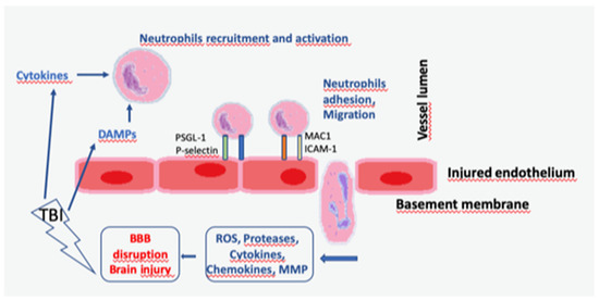 Neutrophil activation and circulation in TBI. After a TBI occurs, cells apoptosis and DAMPs leak into the extracellular spaces and activate immune cells. Activated neutrophils migrate towards the site of the injury. The elevated expression of adhesion molecules in endothelial cells, such as ICAM-1 or VCAM-1 1, increase the attachment and extravasation of peripheral immune cells into the central nervous system. Neutrophils (but also T cells and monocytes) penetrate the BBB. Neutrophils release toxic molecules including reactive oxygen species (ROS), nitrous oxide (NOS), NADPH oxidase, proinflammatory cytokines, and proteases, which advance secondary damage: DAMPs—danger/damage associated molecular patterns; ICAM—intercellular adhesion aolecule; MAC—membrane attack complex; MMP—matrix metalloproteinase; PSGL—P-selectin glycoprotein ligand; TBI—traumatic brain injury.