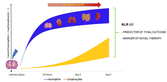 The place of the NLR in clinical management and final outcome prediction after acute brain injury. The peak number of neutrophils that infiltrate the brain is observed 24 h after an injury. The elevation of lymphocytes count is significantly more dynamic, especially after 48 h.