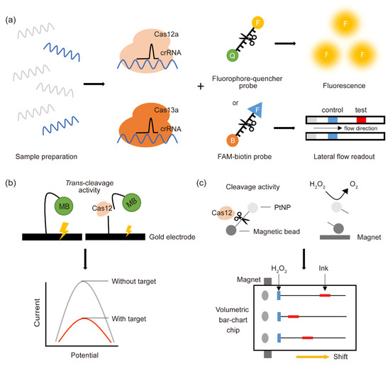 In contrast to Cas9, the more versatile features of Cas12, especially its trans-cleavage activity, make it more suitable for molecular diagnoses [8,26]. These functions can be used to activate various types of reporter molecules. Based on these properties, Cas12-based diagnostic platforms have been developed by coupling several types of reporter systems, including a fluorescent probe, a lateral flow readout, and an electrochemical sensor (Table 2).