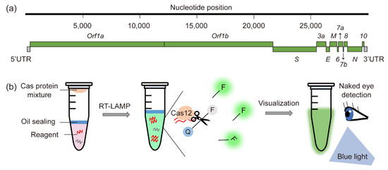 - Guo, L.; Sun, X.; Wang, X.; Liang, C.; Jiang, H.; Gao, Q.; Dai, M.; Qu, B.; Fang, S.; Mao, Y.; et al. SARS-CoV-2 detection with CRISPR diagnostics. Cell Discov. 2020, 6, 34. [Google Scholar] [CrossRef] [PubMed]