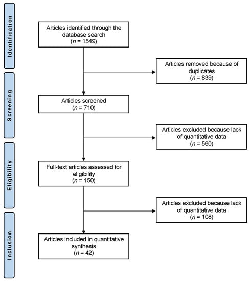 The literature search resulted in 1549 articles. Of these, 839 were excluded as duplicates. Another 560 were not eligible due to not matching the topic (n = 250), study design (n = 201), recurrent, congenital, or habitual patellofemoral instability (n = 103), language limitation (n = 4), and uncertain results (n = 2). This left 150 articles for inclusion. A further 108 articles were excluded because of lack of quantitative data under the outcomes of interest. Finally, 42 articles were considered for analysis (Figure 1).