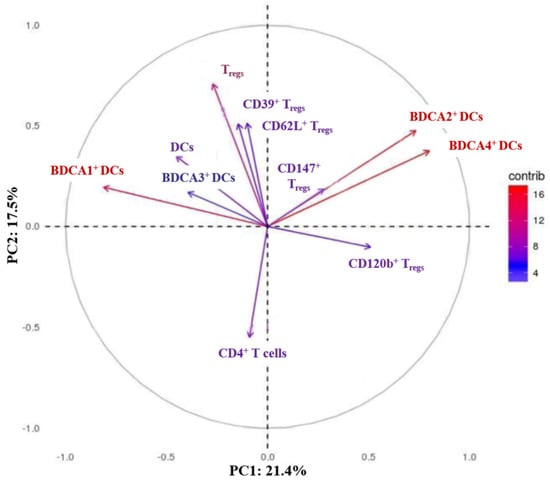 Biplot of the two principal components contributing to the highest variability in a dataset of 11 cellular markers identified using a principal component analysis. This plot illustrates the influence of total DCs, DC subsets, CD4+ T cells, Tregs, and their subpopulations on the discrimination between CNI- and mTORI-treated patients after HTx. Score plots of PC1 and PC2 were visualized for all measured cellular parameters. The contribution to variability range was indicated by different colours (blue = low contribution, red = high contribution). Note: BDCA1/2/3/4, blood dendritic cell antigen 1/2/3/4; CD, cluster of differentiation; CNI, calcineurin inhibitor; DCs, dendritic cells; mTORI, inhibitor of the mechanistic target of rapamycin; PC, principle component; Tregs, regulatory T cells.