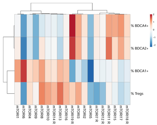 After PCA, clustered heatmaps including the parameters with the strongest influence (BDCA1+ mDCs, BDCA2+ pDCs, BDCA4+ pDCs, and total Tregs) were separately generated for mTORI-treated patients. In the mTORI group, one cluster included 89% (n = 8) of the mTORI-treated patients without rejection and 11% (n = 1) of the mTORI-treated patients with rejection episodes (Figure 2). These patients were characterized by lower percentages of BDCA2+ and BDCA4+ pDCs and higher percentages of BDCA1+ mDCs and total Tregs. The second cluster included 50% (n = 5) mTORI patients without rejection and 50% (n = 5) mTORI patients with rejection. The patients of the second cluster had a higher percentage of BDCA2+ DCs and BDCA4+ pDCs as well as a lower percentage of BDCA1+ mDCs and total Tregs than the patients of the first cluster.