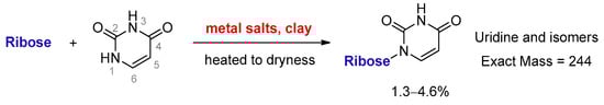 Clay minerals are an important catalyst and platform for synthesizing RNA oligomers []. Cation-exchanged clays have been reported to catalyse organic transformations, such as the formation of acetal [], which is a condensation between aldehyde and alcohol. Therefore, it is reasonable to assume that MDC is able to catalyze nucleosidation, which can also be regarded as a condensation between an aldehyde (sugar) and a nucleophile (pyrimidine). Here, we discovered that uracil and ribose could couple to form a set of desirable products in the presence of metal salts and kaolinite (Figure 1).