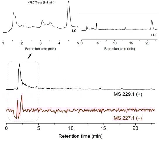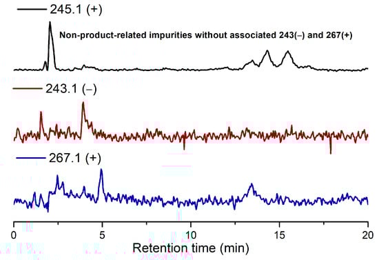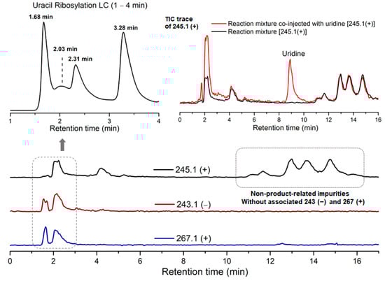 Due to the low reactivity of uracil, a stoichiometric amount of ribose was used, instead of the one adsorbed on MDC. Multiple metal chlorides (CuCl2, FeCl2·4H2O, MgCl2 and CaCl2·2H2O) and a clay mineral (kaolinite) were added together with the reactants (D-ribose and uracil). Chloride was selected as the anion because of its abundance in the early oceans []. The pH of the mixture was adjusted to 5, which should be prebiotically plausible, and the mixture was heated to evaporate water on a shaking dry-bath to simulate the hot–dry conditions on the primordial Earth []. The dried sample was added water and analyzed by liquid chromatography—mass spectrometry (LCMS), equipped with a reverse-phase high-performance liquid chromatography (HPLC) column. It was observed that a set of early eluted peaks (1.7, 2.0 and 2.3 min) were strongly associated with the expected masses of 245 ([M + H]+), 267 ([M + Na]+) and 243 ([M − H]−). To confirm the identity of these signals, a co-injection with authentic β-uridine was performed. There were a group of neighboring peaks between 12 min and 16 min, which should be non-product-related impurities, since they did not have all three characteristic masses of 245(+), 267(+) and 243(−). The intensity of the impurity peaks remained unchanged; thus, they were selected as the internal standards. It was found that in the LCMS analysis of the co-injected sample, besides the signal of β-uridine itself, the total ion chromatography (TIC) signal strengths (scanned for 245.1(+)) at 1.7, 2.0 and 2.3 min, also increased sharply, as seen in Figure 2, in the red curve in the upper right of the figure. These observations indicated that the peaks at 1.7, 2.0 and 2.3 min were probably altered forms of β-uridine and/or its isomers. The most probable case was that the products tended to coordinate with metal cations, which caused a polarity increase, and thus an early elution on the reversed-phase HPLC. To further elucidate the effectiveness of using metal ion and clay, a control experiment in the absence of metal salts and kaolinite was conducted, in which the characteristic MS signals and the corresponding LC peaks were not detected (Figure 3). The formation of the products was further determined by HRMS, the analytical method that the Zare lab used for confirming uracil ribosylation. Besides the desired masses of 245.0777 ([M + H]+), 267.0587 ([M + Na]+) and 243.0622 ([M − H]−), it was also interesting to observe the m/z of the complexes with divalent cations: 134.0265 ([M + Mg]2+), 142.0151 ([M + Ca]2+), 150.0010 ([M + Fe]2+) (see Supplementary Materials).