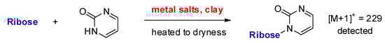 Recently, our lab has demonstrated that metal-doped-clay (MDC) is able to highly selectively adsorb and stabilize ribose from the complex Formose mixture, as well as promote downstream syntheses toward RNA, such as nucleosidation and phosphorylation []. We have successfully carried out the ribosylation of formamidopyrimidine (FaPy) and melamine in the presence of MDC, with both of the nucleobases being non-canonical. It was shown that MDC-retained ribose is highly reactive in these ribosylation reactions. These results encouraged us to explore if MDC has a facilitating effect on previously unachievable transformations. In particular, it would be interesting to explore whether the more challenging canonical nucleobase can be ribosylated under similar conditions. Herein, we present the direct ribosylation of pyrimidine nucleobases, facilitated by the use of metal salts and clay minerals.
