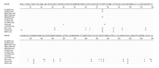 Further, the VP7 nt sequences of the isolates and other representative G-type strains were analyzed for homology. The nt sequence homology between the isolates of this study and the NCDV strain in the VP7 coding region was above 93.4%, and the homology with all other G strains was as high as 77.8%, indicating that all isolates were of the G6 type. The ten isolates were all different from the NCDV strain at positions aa22, aa91, aa187, aa317, and aa326. They differed from RVA strains in China reported at many positions, and the results are showed in Figure 7.