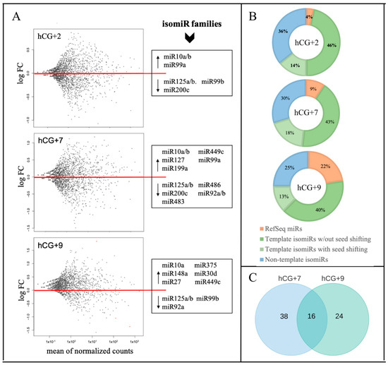 miR/isomiR dynamics during the phase transitions of the endometrial cycle. (A) Relative expression of miR/isomiR, where the three time points of hCG+2, hCG+7, and hCG+9 are compared to the proliferative phase; (B) miR/isomiR percentage distribution; (C) DE miR/isomiR specific to hCG+7 or hCG+9 or overlapped between hCG+7 and hCG+9.