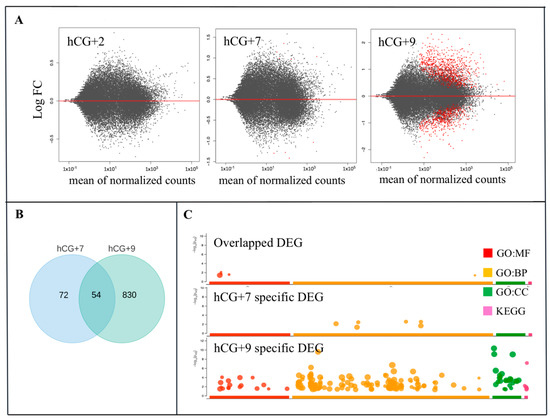 Gene dynamics during the phase transitions of the endometrial cycle. (A) Relative gene expression and the three time points hCG+2, hCG+7, and hCG+9 are compared with the proliferative phase; (B) DEGs that are specific for hCG+7 or hCG+9 or that are overlapped between hCG+7 and hCG+9. (C) GO ontology enrichment of the specific and overlapped DEGs. GO, gene ontology; BP, biological processes; MF, molecular function; CC, cellular component. KEGG, Kyoto Encyclopedia of Genes and Genomes.