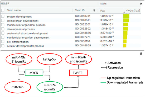Interactions of DE miRs and isomiRs with DE target transcripts and TF in the receptive endometrium. (A) GO ontology enrichment of DE target transcripts. GO:BF are presented; (B) TF-miR/isomiR-gene regulatory circuit. MYCN is a target of miR-449c 5′-isomiRs and let7g-5p and regulates the expression of miR-92a isomiRs and miR-345. TWIST1 is a target of miR-92a isomiRs and regulates the expression of the miR-10a and miR-10b isomiR families.