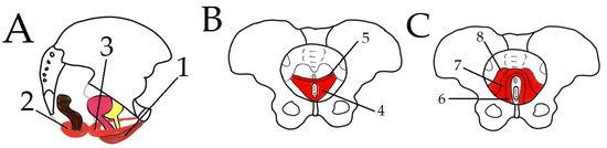 Layers of PFM: (A) superficial PF, (B) middle PF, and (C) deep PF. 1—Ischiocavernosus muscle; 2—sphincter ani externus muscle; 3—bulbospongiosus muscle; 4—deep transverse perineal muscle; 5—superficial transverse perineal muscle; 6—puborectalis muscle; 7—pubococcygeus; 8—iliococcygeus.
