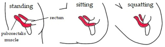 - Takano, S.; Sands, D. Influence Of Body Posture on Defecation: A Prospective Study of “The Thinker” Position. Tech. Coloproctol. 2015, 20, 117–121. [Google Scholar] [CrossRef] [PubMed]