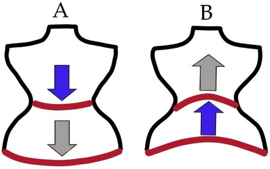 PFM are linked by myofascial connections with the diaphragm, transverse abdominal muscle, intercostal muscles, oblique abdominal muscles, and thoracolumbar fascia, and thus, PF influences breathing [8,21]. When inhaling, the diaphragm contracts and flattens, thereby increasing the space of the thoracic cage, and moves caudally. During inspiration, the anterolateral abdominal wall slightly expands, while the PFM move posteroinferiorly. During expiration, the diaphragm relaxes and becomes cephalic, and the anterior abdominal wall muscles contract, as do the PFM, which move anterosuperiorly. The optimal intra-abdominal pressure is maintained by these cyclic tensions and muscle movements in specific directions [8,15,22]. Figure 4 illustrates the functions of the diaphragm and PFM during breathing. It is worth emphasizing that the EMG activity of PFM takes place even before the beginning of inhalation [23]. On the other hand, the amplitude of the PFM activity is higher during exhalation, due to the activation of the abdominal muscles, which also confirms the relationship between the functions of postural muscles and PFM [22]. If any of the above-described muscle parts are in constant tension, the intra-abdominal pressure will increase excessively. A chronic increase in pressure in the abdominal cavity may lead to the dysfunction of PFM or abnormalities in the respiratory pattern, resulting in further disorders [8,15,22].