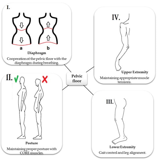Relationship of PF with other structures and their functions. (I) The figure depicts the cooperation of PF with the diaphragm. PF works together with the diaphragm and takes part in respiration. During inhalation (a), the diaphragm descends caudally, as does PF, whereas during exhalation (b), the diaphragm relaxes and becomes cephalic and the PF contracts. This allows maintaining optimal intra-abdominal pressure [8,15,22]. Any disturbance in the synchronicity of the diaphragm and PF will result in pressure changes and subsequently dysfunction of other areas (e.g., disturbances in peritoneal drainage or postural stability) [21,25]. (II) The figure depicts the role of PF in stabilizing the body posture. PF together with postural muscles, such as abdominal, gluteal, and multifidus muscles, ensures proper stabilization. Its activity is influenced by the tension of the other core muscles. PF is also connected to the trunk by the transversalis and thoracolumbar fascia [19,20,21,22,23,24]. Myofascial disorders in this complex can change the PF tension and result in painful menstruation or intestinal disorders leading to chronic constipation. However, primary dysfunction of the PF will lead to disturbances in the entire pelvic–lumbar complex, affecting the stabilization and body posture [21,25]. (III,IV) The figure depicts that proper functioning of the PF is also influenced by the myofascial connections with the extremities. PF is connected to the lower extremity by a fascia associated with the gluteal muscles and the internal obturator muscle. These muscles control the actions of the hip joint, and thus regulate the biomechanics of the lower limb. Abnormal tension in the buttock area will disturb the movements of the hip joint, causing changes in the mechanic load on the lower limb and locomotion. Additionally, dysfunction of the hip joint and the entire lower limb will predispose to PF disorders [8,18,24]. As the gluteal muscles also play a role in postural stability, disturbances in stabilization will also lead to disorders of these muscles. PF is connected to the upper limb complex as well as the cervical spine and face through the following fascia: transversalis, mediastinal, and cervical. Therefore, disorders in this myofascial tract may lead to dysfunctions of the upper limb and diaphragm and also bruxism [8,21,25].