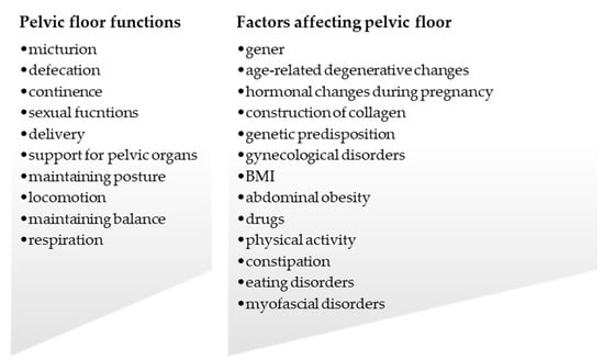 PFD are not a marginal problem, and approximately 25% of women are affected by one of them [86]. The incidence of PFD in women increases with age. Over 50% of women aged over 80 have PFD, which affects their quality of life. The most common PFD among women is urinary incontinence [42], while about 90% of women who have overactive PFM also have PFD [80]. Many factors contribute to PFD, and the most important among them are female gender, previous births (especially VD), older age, menopause, and abdominal obesity. Chronic cough, which is observed in many respiratory disorders, constipation, and incorrect toilet habits lead to an increase in abdominal pressure, which weakens ligaments and the supporting structures of PF. Congenital disorders of the connective tissue change the properties of collagen and thus contribute to PFD. The benefits of physical activity for PFD are still debated, as the research results are contradictory exclusive. Eating disorders also lead to weakening of PF; however, this is rarely emphasized in the literature. Because the human body functions as a cohesive unit, malfunctions in one segment will have an impact on others. Through myofascial connections, abnormalities in diaphragm and breathing patterns, gait, and other musculoskeletal functions, as well as formation of TrPs lead to functional disorders in PF, which will negatively affect the rest of the body. The most important functions and factors affecting PF are shown in the Figure 7.