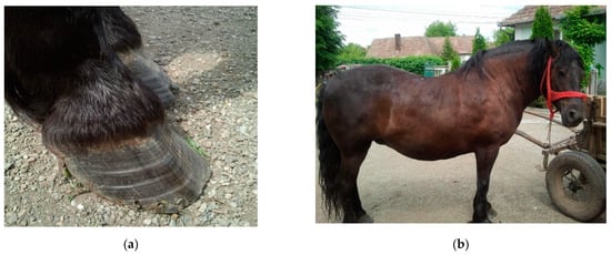 Ex. A 7-year-old Romanian Draft Horse mare with physical characteristics of equine metabolic syndrome and laminitis: (a) divergent growth rings in the hoof, indicating laminitis; (b) general physical aspect of the horse with EMS. Source: author’s private collection.