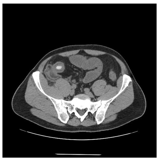 - Sohail, U.; Ashraf, I.; Mir, F.; Wu, Z.; Hammad, H. Calcified Foreign Body Causing Intestinal Obstruction in a Patient With Crohn’s Disease. Am. J. Gastroenterol. 2015, 110, S29. [Google Scholar] [CrossRef]