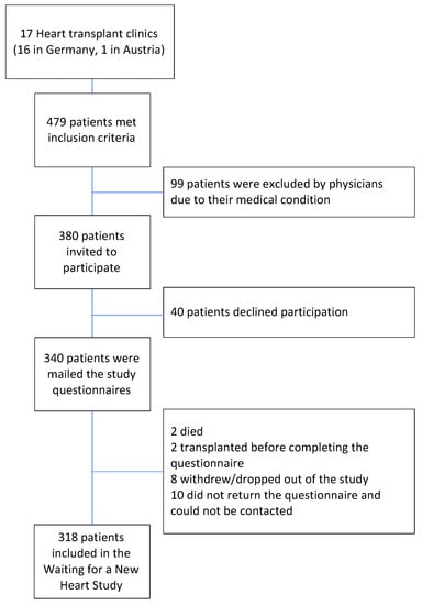 The study procedures have been described in detail previously []. Shortly, informed consent was obtained from patients who were newly registered on the waiting list between April 2005 and December 2006. Patients were eligible for inclusion in the study if they were registered on the Eurotransplant HTx waiting list, 18 years or older at the time of listing, able to speak German fluently, had not received a donor heart before, and did not require a combined heart–lung transplantation. There were 380 patients in 17 hospitals who met the inclusion criteria and were invited to participate. Of these, 340 patients consented and were sent the questionnaires. Complete responses were obtained from 318 patients, yielding a 93.5% response rate (Figure 1).