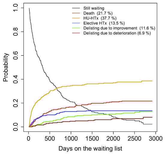 For patients with advanced heart failure, the wait for a heart transplantation (HTx) can be long. According to Eurotransplant, in 2020 there were approximately 350 heart transplants and 700 people in Germany on the heart waiting list [,]. The waiting period can be difficult for patients, both physically and psychologically [,]. Due to illness severity, some patients are admitted to the hospital and monitored to ensure satisfactory condition until transplantation []. The most common clinical outcomes for patients on the waiting list are death, heart transplantation (either high-urgency or elective), and delisting due to either clinical deterioration or improvement.