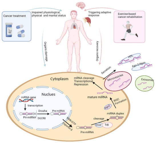 The impact of cancer treatment and physical activity on miRNA biogenesis. Organ damage can be caused as a result of cancer or as an adverse effect of cancer treatment, leading to decreased physical and mental ability and poor quality of life for cancer survivors, while exercise-based cancer rehabilitation triggers adaptive responses, resulting in altered miRNA expression, in damaged organs, thus promoting in organ recovery and improved quality of life. The diagram illustrates the changes in miRNA expression that can occur during tissue damage, toxicity, treatment side effects, and during physical activity, and this is part of the adaptive process or physiologic responses to exercise. During tissue damage, miRNAs may be released into circulation. miRNA biogenesis and molecular mechanisms of miRNA production can also be altered by disease or as a response to physical activity. miRNA biogenesis begins in the nucleus, where primary miRNA (pri-miRNA), transcribed by miRNA gene, is processed by Drosha and Dgcr8 into stem-looped structures, precursor miRNA (pre-miRNA). Pre-miRNA is exported by Exportin 5 into cytoplasm, where mature miRNA is produced after further processing by Dicer. Mature miRNA is transported out of cell by either exocytosis or combining protein complex, regulating gene expression in cancer treatment-induced complications or adaptive changes during exercise-based cancer rehabilitation.