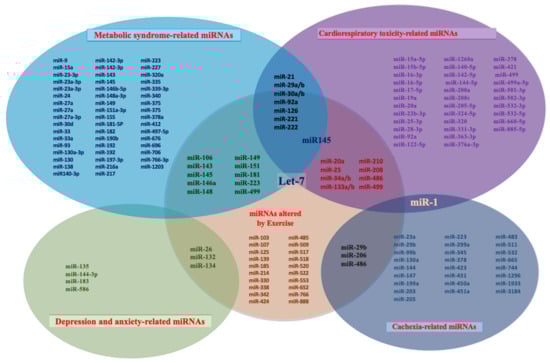 As physical activity and exercise training can manage weight gain and balance calories, exercise is a promising treatment strategy for cancer treatment-induced metabolic syndrome. A population-based prospective cohort study recruiting 1696 breast cancer survivors showed that regular exercise diminished the prevalence of metabolic syndrome from 55.18% at baseline to 33.14% at 60 months postdiagnosis []. Zhou et al. [] recruited 209 subjects with metabolic syndrome and 234 controls to investigate the correlation between physical activity-related miRNAs and metabolic syndrome. Results showed that, among 55 miRNAs detected, only miR-197, miR-126, and miR-130a were significantly correlated to physical activity. Moreover, the expression of miR-126 and miR-130a was lower in the most active participants with the highest metabolic equivalent hours per week of physical activity (MET-h/week). In other words, individuals with the highest MET-h/week had a lower risk of metabolic syndrome. By contrast, miR-197 expression was elevated with increased physical activity or MET-h/week. However, after adjustment for age, sex, and disease settings, results showed that miR-126 significantly increased the risk of metabolic syndrome. At the same time, miR-197 decreased the risk, suggesting the correlation between physical activity and metabolic syndrome risk may partly rely on miR-126 and miR-197.