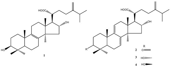 The dried P. cocos (10 kg) was extracted three times by refluxing with 75% ethanol for 3 h [24]. The concentrated extract was chromatographed on silica gel (70–230 mesh) using increasingly polar mixtures of CH2Cl2 and MeOH (CH2Cl2:MeOH, 97:3; CH2Cl2:MeOH, 96:4; CH2Cl2:MeOH, 90:10, and 100% MeOH). According to the thin-layer chromatography (TLC), four fractions (Fr.1–Fr.4) were collected for further separation. The Fr.1–Fr.3 were subjected to preparative high-performance liquid chromatography (HPLC) (Waters Prep 150 LC system, Milford, MA, USA) on a Waters XBridge RP-18 column (250 mm × 19 mm, 5 μm, Milford, MA, USA) using 80% methanol as the mobile phase system. The flow rate was 18 mL/min. Four major peaks of interest were selectively collected. The fractions containing the targeted compounds were further condensed into dryness and produced tumulosic acid (1) (120.1 mg), polyporenic acid C (2) (16.0 mg), 3-epi-dehydrotumulosic acid (3) (12.1 mg), and dehydrotumulosic acid (4) (6.8 mg), respectively. Their structures were elucidated by NMR (nuclear magnetic resonance) spectroscopy analysis and electrospray ionization mass spectrometer (ESI-MS) and by comparison with literature data [32].