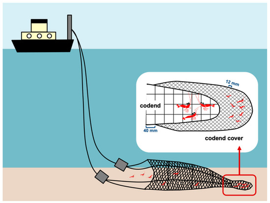 Planella et al. [10] delineated the mating structure of A. antennatus in the fishing ground of Palamós Canyon (hereafter “Palamós fishing ground”), Spain, in the summer of 2015. In the present study, A. antennatus males were captured on board the same trawling vessel (Nova Gasela) at Palamós fishing ground (500 m depth, 41°54′04′′ N, 3°16′08′′ E) during March (winter) and July (summer) of 2016 to determine the growth and recruitment of males in the area. The winter sampling period (3 March) corresponded to the period when peak numbers of juveniles are detected in the coastal areas of the western Mediterranean [26]. The summer sampling period (7 July) corresponded to the peak of the spawning season, when almost all captured females have at least one spermatophore adhering to the thelycum [10]. The codend had square meshed windows with an aperture of 40 mm (minimum commercial mesh size allowed at the time of this study), and was surrounded by a smaller meshed cover (hereafter “codend cover”), with an aperture of 12 mm usually intended for smaller individuals. Thus, the codend cover captures organisms escaping from the codend (Figure 1). The codend cover was directly attached to the funnel end of the net which was 1.5 m wider and longer than the codend to maintain a good flow of water and avoid masking the codend mesh (see [3]). The codend in this study is commonly used for commercial purposes in the Palamós fishing ground, whereas the codend cover was legally authorised for this scientific sampling procedure. Winter and summer samplings were conducted in the same way. A single haul with the same fishing gear was conducted per sampling period (winter and summer). The towing speed was around two knots and the effective towing duration was two hours. Specimens from the codend and codend cover were independently sexed on board, and a random sample of around 100 males of each group (codend and codend cover) were kept for this study. Each male was classified as juvenile or adult based on the criteria established by Demestre and Fortuño [16] and Sardà and Demestre [18]. All males captured in the codend during March had a fused petasma, and were considered adults. In total, 101 individuals were retained for genotype analyses. Despite some specimens in the codend cover having adult petasma morphology (fused hemipetasmas), most males had two separate hemipetasmas, and were considered as juveniles. In total, 105 of these juveniles were retained for the analysis. In July, all males collected in the codend were adults, and 100 were retained for the analysis. In contrast to the winter collection, all males (except one) captured in the codend cover had fused petasma, and were not considered as juveniles. Ninety-eight of these males were genotyped. All captured specimens were stored on ice on board, and were quickly transported to our laboratory on landing. At the laboratory CL was measured using a digital vernier calliper. A piece of muscle tissue was preserved in 95% ethanol and stored at room temperature until subsequent DNA extraction.