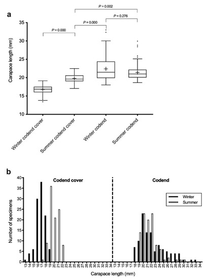 The A. antennatus juveniles captured in the codend cover during winter had the lowest mean CL (16.79 ± 1.15 mm), which significantly differed to all other analysed groups (Figure 2). Males captured in the codend cover during summer were significantly larger than winter juveniles, with a mean CL of 19.82 ± 1.10 mm; however, these males were smaller than adults collected in the codend during winter or summer. Adult males captured in the codend during summer had a mean CL of 21.43 ± 2.06 mm, which was not significantly different to the mean size of winter adults (22.39 ± 3.34 mm). The largest adult male specimens were among those captured in winter.
