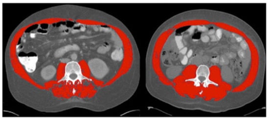 Computed tomography (CT) images at the third lumbar vertebra comparing two patients with cirrhosis and same body mass index but one has sarcopenia and other is not. Left image shows sarcopenia with L3mi of 49.82 cm2/m2. Right image shows non-sarcopenia with L3mi of 70.8 cm2/m2. These abdominal CT images were utilized by Montano-Loza et al. in 2012 and cutoff-values offered by Baumgartner et al. in 1998. Red color denotes abdominal wall muscle, psoas and paraspinal muscles. (Used with permission from Elsevier.).