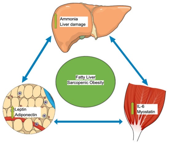 Several pathophysiological mechanisms, such as insulin resistance, high pro-inflammatory cytokines, decreased exercise, and hormonal changes have been described as common pathways for both NAFLD and sarcopenic obesity [59]. The increased expression of pro-inflammatory genes can play a significant role in the recruitment of immune cells into the adipose tissue during weight gain [60]. The secretion of inflammatory mediators or the recruitment of macrophages is strongly linked to the remodeling of adipose tissue and to the pathogenesis of co-morbidities during obesity [60]. The muscle-liver-adipose tissue axis has been suggested as a leading cause of NAFLD and sarcopenic obesity, as shown in Figure 2 [61,62,63], though the exact interplay between skeletal muscle, liver, and adipose tissue is still not yet fully understood. Adipose tissue has been recognized as an endocrine organ that secretes hormones called adiponectin and leptin, both of which play a vital role in regulating insulin sensitivity, glucose, and lipid metabolism [61,64]. First, adiponectin enhances insulin sensitivity and has antifibrotic, anti-inflammatory, and antisteatotic effects on the liver [64,65]. Therefore, the reduction in the adiponectin level leads to insulin resistance and glucose intolerance and may lead to hepatic injury and fatty liver [64,65]. Second, leptin stimulates hepatic stellate cells, which in turn enhances the process of fibrogenesis and inflammation in the liver [61,66]. Once the hepatic stellate cell is activated, it can also produce more leptin and further strengthen the fibrogenesis cascade, eventually leading to more liver fibrosis and cirrhosis [61,66]. Furthermore, leptin promotes the progression of liver fibrosis by stimulating the synthesis of transforming growth factor beta (TGFß) in the Kupffer cells [61].