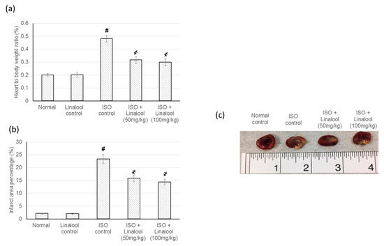 3.2. Effect of Linalool on Infarcted Area and Heart to Body Weights Ratio