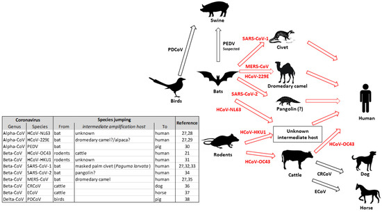 Representation of interspecies jumping of Coronaviruses. Red arrows indicate cross-species transmission involving an intermediate (proved, suspected or undetermined) amplifying host. Black arrows represent a direct transmission between two species [21,27,28,29,30,31,32,33,34,35,36,37,38].