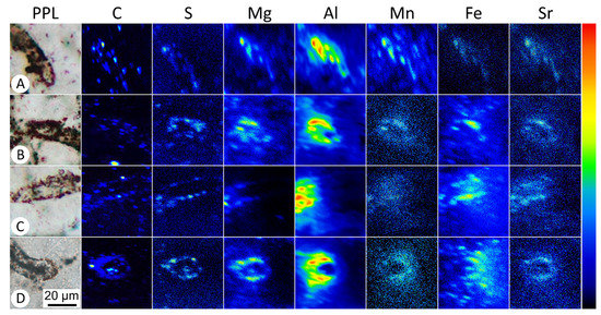 Among the fossils analyzed, several trace elements were found in consistent distribution patterns. Mg, Al, Mn, Fe, and Sr showed consistent elevated concentrations within microfossil bodies (Figure 2), with each microfossil exhibiting a higher concentration of each respective element than the background concentration in the surrounding quartz matrix (Figure 3; Supplementary Materials). Raman analysis of microfossils showed only the presence of kerogen and quartz in the acquired spectra, suggesting a substantial mineral-control for the observed elemental distributions is not likely (Supplementary Materials). Aluminum showed consistently high concentrations colocalized with filament bodies, with calculated concentrations ranging from 2 to 6% (average = 3.2%). XRF analyses of the host rock verified that Al was indeed naturally abundant in the host rock, at nearly 1.7% (Table 1, Supplementary Materials). Within the fossils, magnesium was found in concentrations ranging from ~30 to 350 ppm (average = 128 ppm), manganese in lower concentrations ranging from ~7 to 50 ppm (average = 19 ppm), iron in concentrations ranging from ~200 to 1600 ppm (average = 524 ppm), and strontium in concentrations ranging from ~8 to 35 ppm (average = 18 ppm).
