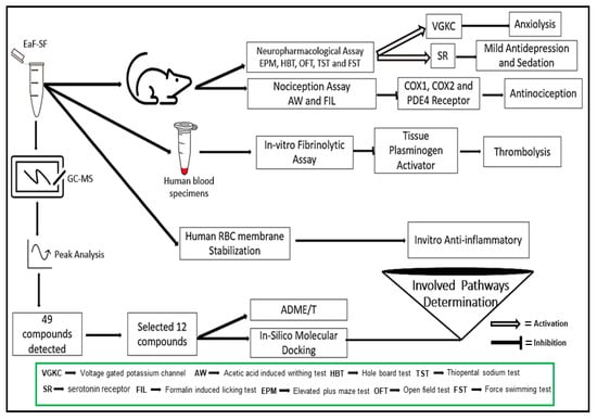 - Adnan, M.; Chy, M.; Uddin, N.; Kamal, A.T.M.; Chowdhury, M.; Islam, M.; Hossain, M.; Tareq, A.M.; Bhuiyan, M.; Hossain, I. Unveiling Pharmacological Responses and Potential Targets Insights of Identified Bioactive Constituents of CuscutareflexaRoxb. Leaves through In Vivo and In Silico Approaches. Pharmaceuticals 2020, 13, 50. [Google Scholar] [CrossRef] [PubMed]