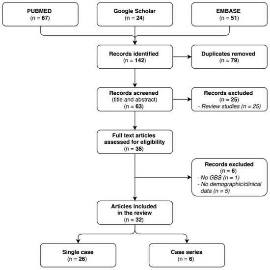 We identified 63 articles in the researched databases, and 32 of them were included in our systematic review. The 32 selected studies reported on a total of 41 GBS cases with a confirmed or probable COVID-19 infection: 26 of them were single case reports and 6 case series. The flow diagram (see Figure 1) shows the results from the literature search and the study selection process.
