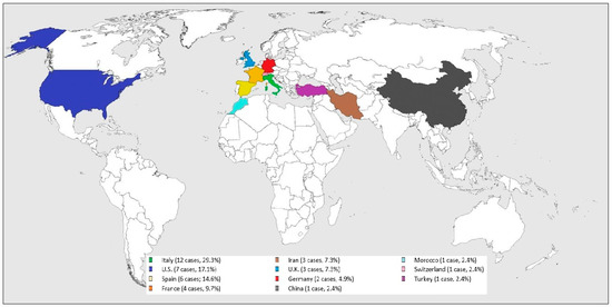 All the cases were from COVID-19 epidemic or endemic regions (see Figure 2): 12 cases were from Italy (29.3%), 7 from U.S. (17.1%), 6 from Spain (14.6%), 4 from France (9.7%), 3 from Iran (7.3%) and U.K. (7.3%), 2 from Germany (4.9%), and one from China (2.4%), Morocco (2.4%), Switzerland (2.4%), and Turkey (2.4%).