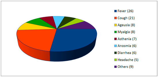 All studies reported the presence of clinical symptoms of SARS-CoV-2 infection (see Figure 3). Two or more symptoms were present in 87.5% of cases. The most common symptoms were fever (63.4%, 26/41 cases), cough (51.2%, 21/41 cases), ageusia (22%, 9/41), myalgia (19.5%, 8/41), asthenia (17.1%, 7/41), anosmia (17.1%, 7/41), diarrhea (14.6%, 6/41), and headache (12.2%, 5/41). Others reported symptoms were chills, dyspnea, dizziness, and pruriginous rash.