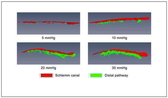 Structural connections between Schlemm’s canal and its distal pathways at different perfusion pressures oriented in the X-Y plane.