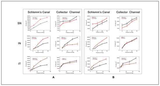 Curves of pressure-dependent changes in Schlemm’s canal and collector channels areas under different perfusion pressures before and after a large fluid bolus. (A) The elastance curve of eye #1 and (B) eye #2. In each plot, the black line is before and the red line after the fluid bolus. The first row is the superior nasal (SN), the middle the inferior nasal (IN), and the bottom the inferior temporal (IT) quadrant.