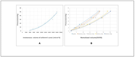 We find an increase in SC lumen area as SC pressure increases indicative of TM tissue deformation with the accrual of elastic energy (Figure 5A). Lumen area configuration depends on the biomechanical properties of the surrounding tissues. We develop volumetric stress-strain curves (elastance curves) using volume as the dependent variable. However, we add rapidity of volume change as a second experimentally controlled variable (Figure 5B). We find synchronous SC and CC lumen dimensions changes (Figure 4) indicative of synchrony of the TM motion and the tissue surrounding CCs. The correlated movement of the TM and CC entrance tissues is consistent with the findings of prior studies [].