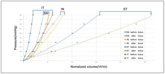 Changes of elastance curves of the trabecular meshwork induced by a fluid bolus. Blue arrows indicate the before and after curves for the same quadrant. ST: superior temporal; IT: inferior temporal; SN: superior nasal; and IN: inferior nasal.