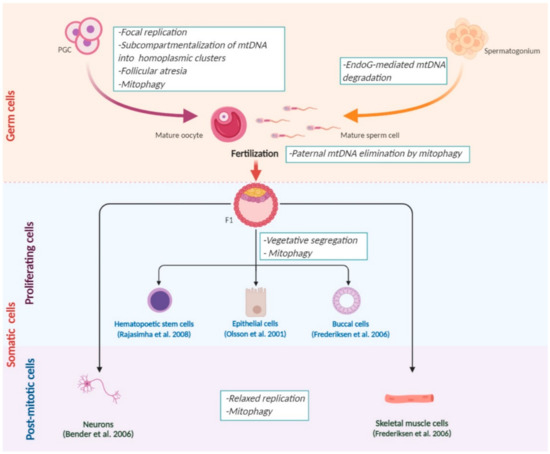 The genetic dynamics of mitochondrial DNA (mtDNA) is regulated via diverse mechanisms during mammalian development. In the maturation process, female oocytes undergo negative selection supposedly happening just before the developmental bottleneck. The oocytes with high mtDNA mutation load could be eliminated via follicular atresia. At the same time, during spermatogenesis, endonuclease G (EndoG)-mediated mtDNA degradation occurs. During fertilization, the mitophagy of male mitochondria takes place to prevent paternal mtDNA transmission to the next generation (F1). Since the early stages of embryogenesis, mtDNA is randomly distributed between daughter cells during mitosis due to vegetative segregation. In non-dividing cells, one of mtDNA variants might have a replicative advantage due to relaxed replication. These two mechanisms might proceed in parallel in different somatic tissues within one organism to regulate the genetic dynamics of mtDNA. Additionally, mtDNA heteroplasmy can shift toward healthy or mutant variant in development because of the mitophagy process (figure created in BioRender.com).