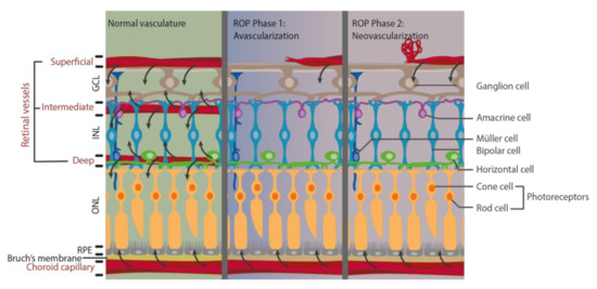 Pathological vascular changes in ROP affect nutrient delivery and normal metabolism, which leads to the damage of retinal structure and function (Figure 1). In normal human fetus, retinal vessel development starts at gestational age 16 weeks and expands toward the peripheral retina [11,44]. When the infant is born prematurely, retinal vasculature is still incomplete, and thus, the retina has a peripheral avascular zone. As the cardiopulmonary system is immature, supplemental oxygen therapy is usually provided. However, this hyperoxic environment leads to the first phase of ROP, namely avascularization. Excessive oxygen supply suppresses and interrupts the normal retinal vascular development by inhibiting important angiogenic factors. Hypoxia-inducible factor-1 (HIF-1), VEGF, insulin-like growth factors-1 (IGF-1), nitric oxide (NO), erythropoietin (Epo), and adenosine are downregulated and resulted in interrupted retinal vascular development and retinal avascular zone in phase 1 [16]. The second phase of ROP, neovascularization, begins when the infant returns from supplemental oxygen to room air with a relatively lower oxygen concentration. Oxygen and energy demands cannot be fulfilled when choroid capillary is the only blood supply for metabolism in the avascularized retina [38]. Hypoxia is now generated in phase 2, which stimulates the production of HIF-1, VEGF, IGF-1, NO, Epo, and adenosine. Then, uncontrolled vascular proliferation starts in the avascularized retina by the upregulated angiogenic factors [16,44,45]. Vaso-obliteration in phase 1 of ROP leads to metabolic imbalance under hypoxia in phase 2, which in turns induces pathological neovascularization in ROP.