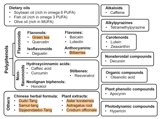 Abnormal neovascularization in ROP phase 2 is closely associated with metabolic shortage that is caused by the avascularized retina in phase 1. To maintain the metabolic needs in the normal retina, protection of the vasculature is one way to prevent and manage ROP. Providing nutraceuticals is a novel non-invasive strategy to prevent or protect against ROP. In addition to playing a protective role as anti-oxidative, anti-inflammatory, and/or anti-proliferative agents, nutraceuticals can also be provided as a nutritional supplement for postnatal infant growth, which is directly associated with ROP severity [54]. Nutraceuticals can be classified into different classes, such as oils, flavonoids, non-flavonoids, alkaloids, alkylpyrazines, carotenoids, nonsteroidal compounds, organic compounds, photodynamic compounds, plant phenolic compounds, Chinese herbal formula, and other plant extracts (Figure 2). They exert antiangiogenic, antioxidative, and/or anti-inflammatory effects on ROP progression shown in basic translational studies using in vitro and in vivo approaches (Table 1) as well as clinical studies (Table 2).